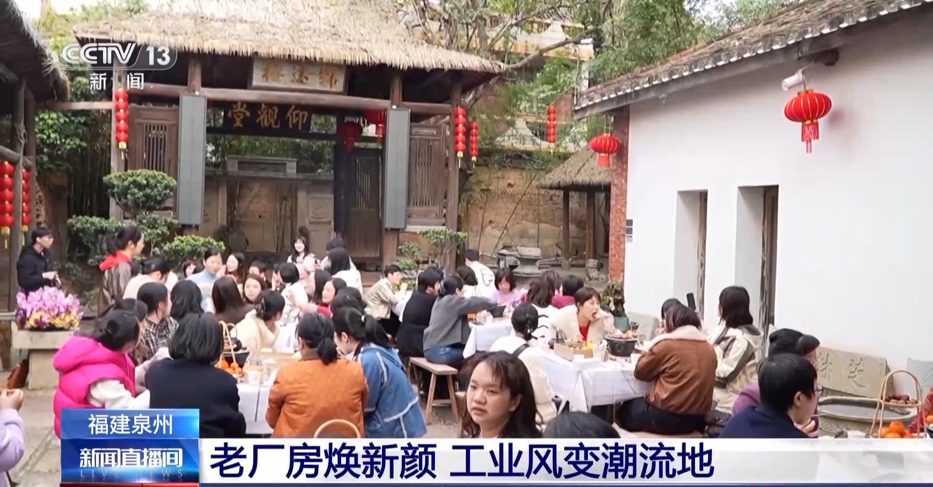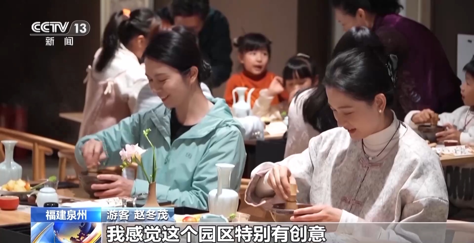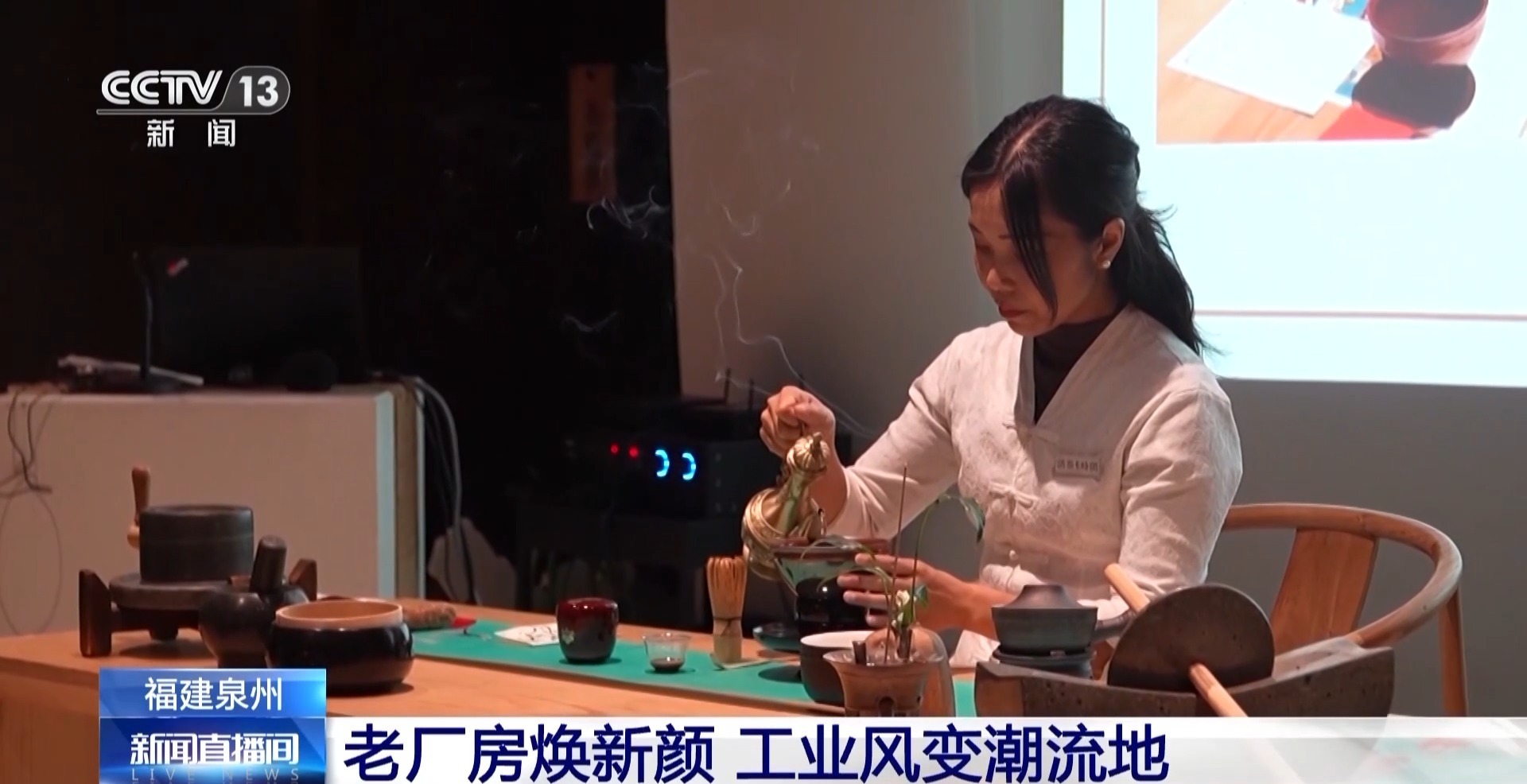 总台记者 阮思潼:我现在正在体验的就是传统茶艺,宋式点茶。看我身后古色古香的环境,大家一定想象不到,这儿之前其实是旧面粉厂的制粉车间。现在它被改造成了一个大型的茶艺空间,不仅可以在这里休憩、品茶,还可以进行一些活动的体验,感受古风国韵。