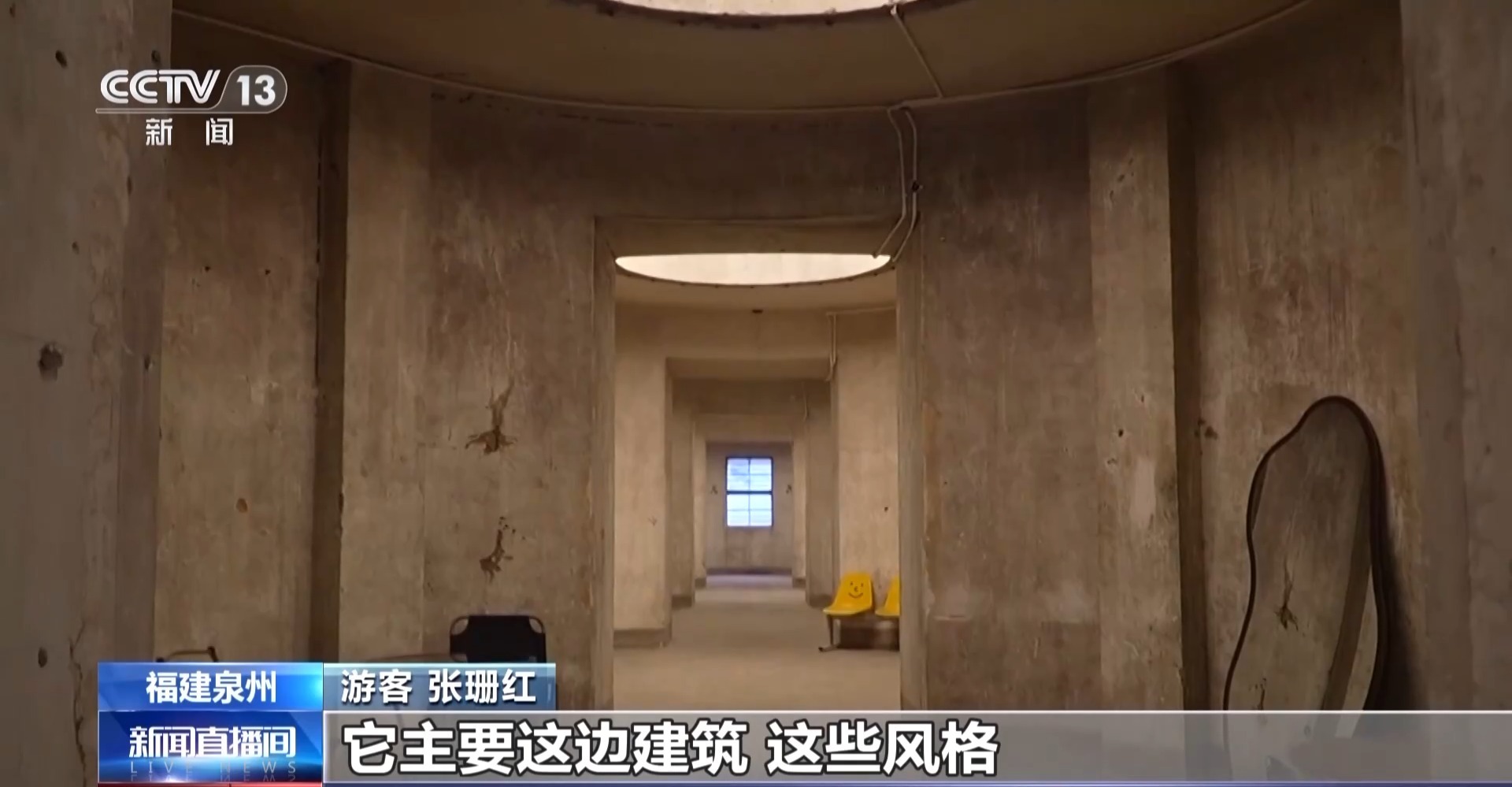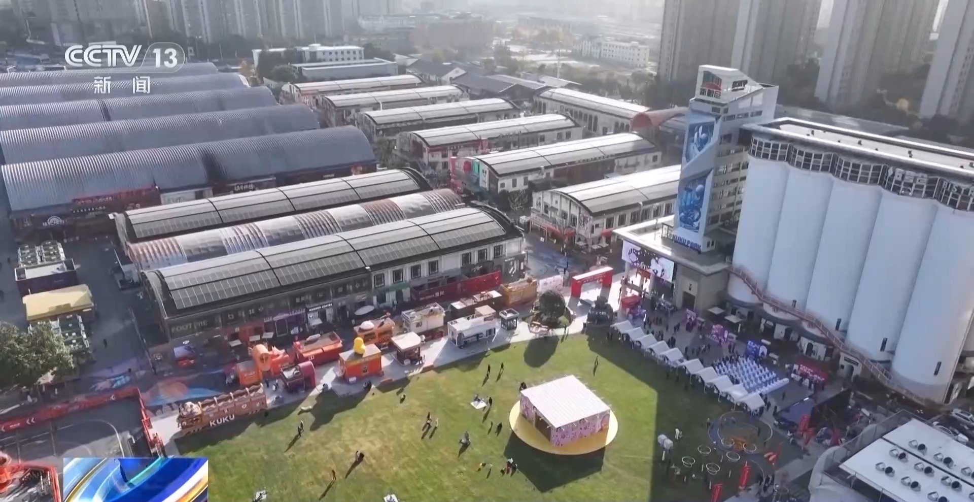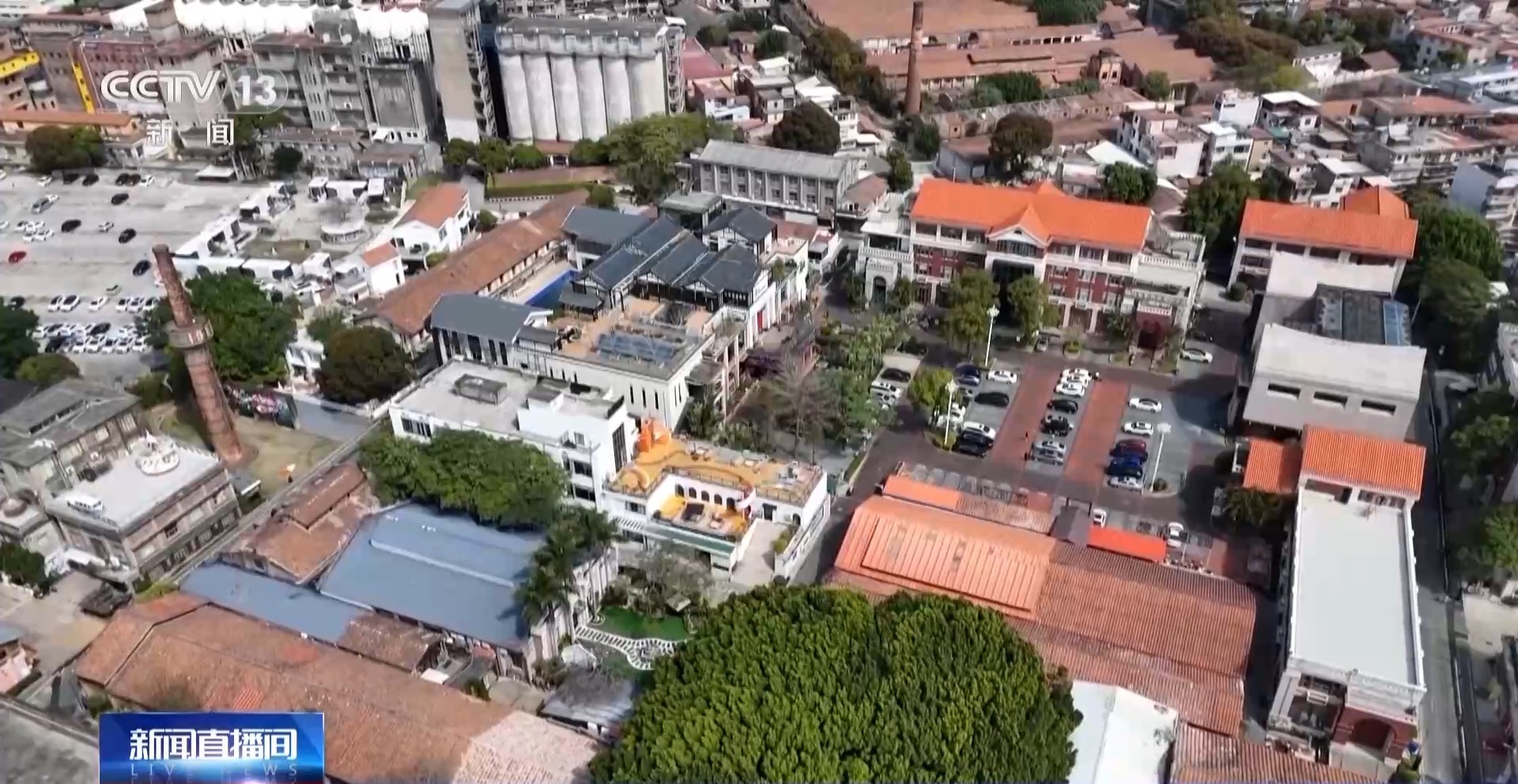 总台记者 阮思潼:在福建泉州源和1916创意产业园,随处都能感受到新旧时光交融带来的独特韵味。在这个产业园内,最引人瞩目的是一座高达二十多米的红砖大烟囱,它是旧蜜饯厂时期遗留下来的工业建筑,现在它的周围装点上了各式各样的创意装置。这里一些老工业厂房的墙面上,也画满了各种各样、不同颜色的卡通墙绘,也让这片斑驳的墙面焕发出了新的生机。