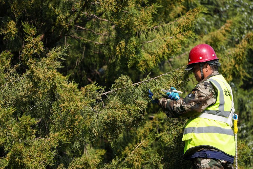 3月15日,在北京地坛公园,工作人员在修剪柏树雄株上的雄球花。新华社记者 鞠焕宗 摄